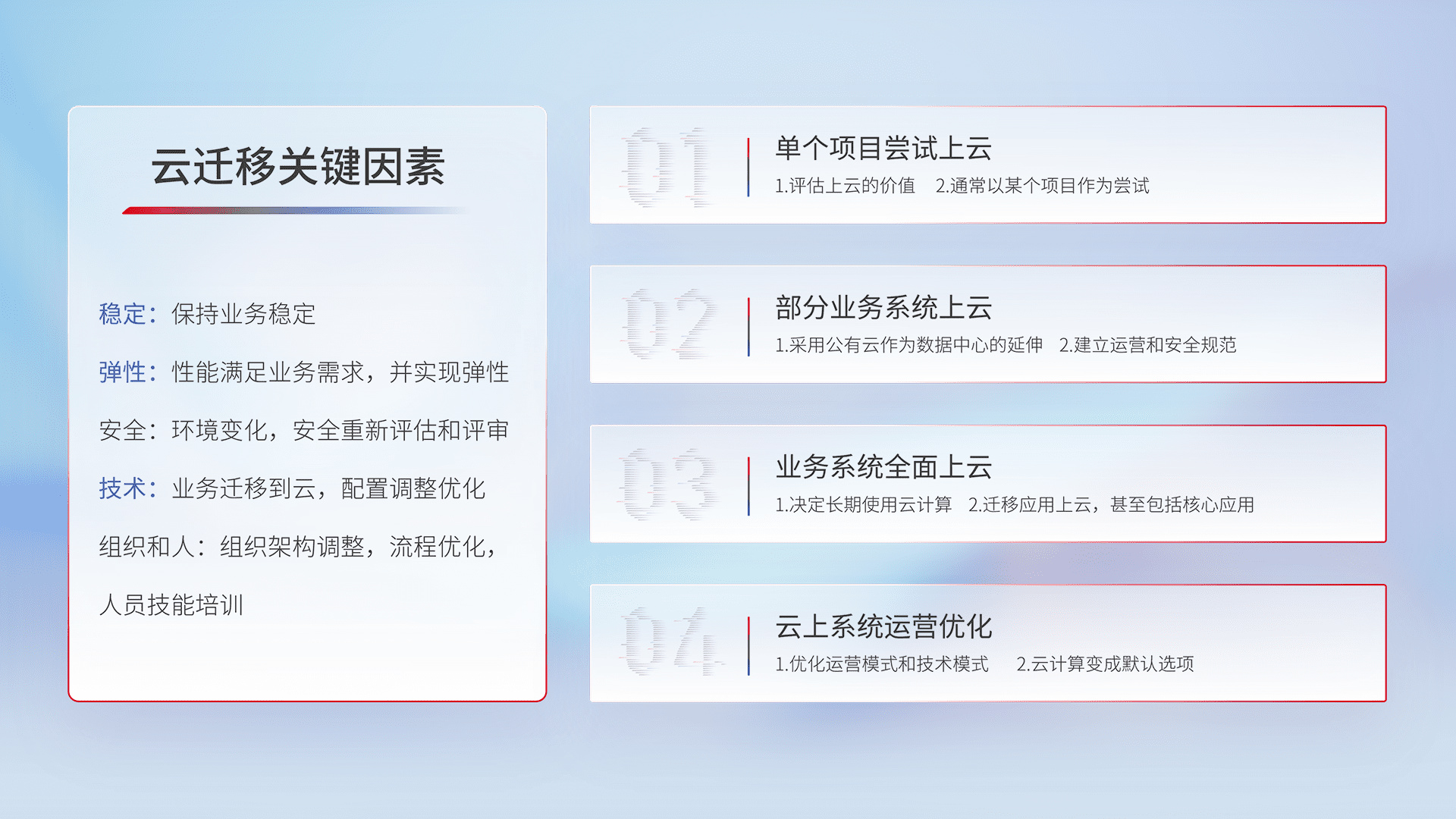 结合实际业务,,从规划设计、、、云平台选型、、、云原生改造、、、数据迁移、、、集成交付,,,迁移全过程为客户识别最佳上云路径,,,,做好风险识别管理,,,,设计网络架构、、、身份权限、、安全审计合规、、、、操作审计、、、日志审计、、监控告警策略、、、多站点容灾设计等,,,,对云上基础设施进行整体规划,,,,提升IT治理水平,,,以满足弹性、、、高可用、、、高性能的需求。。。