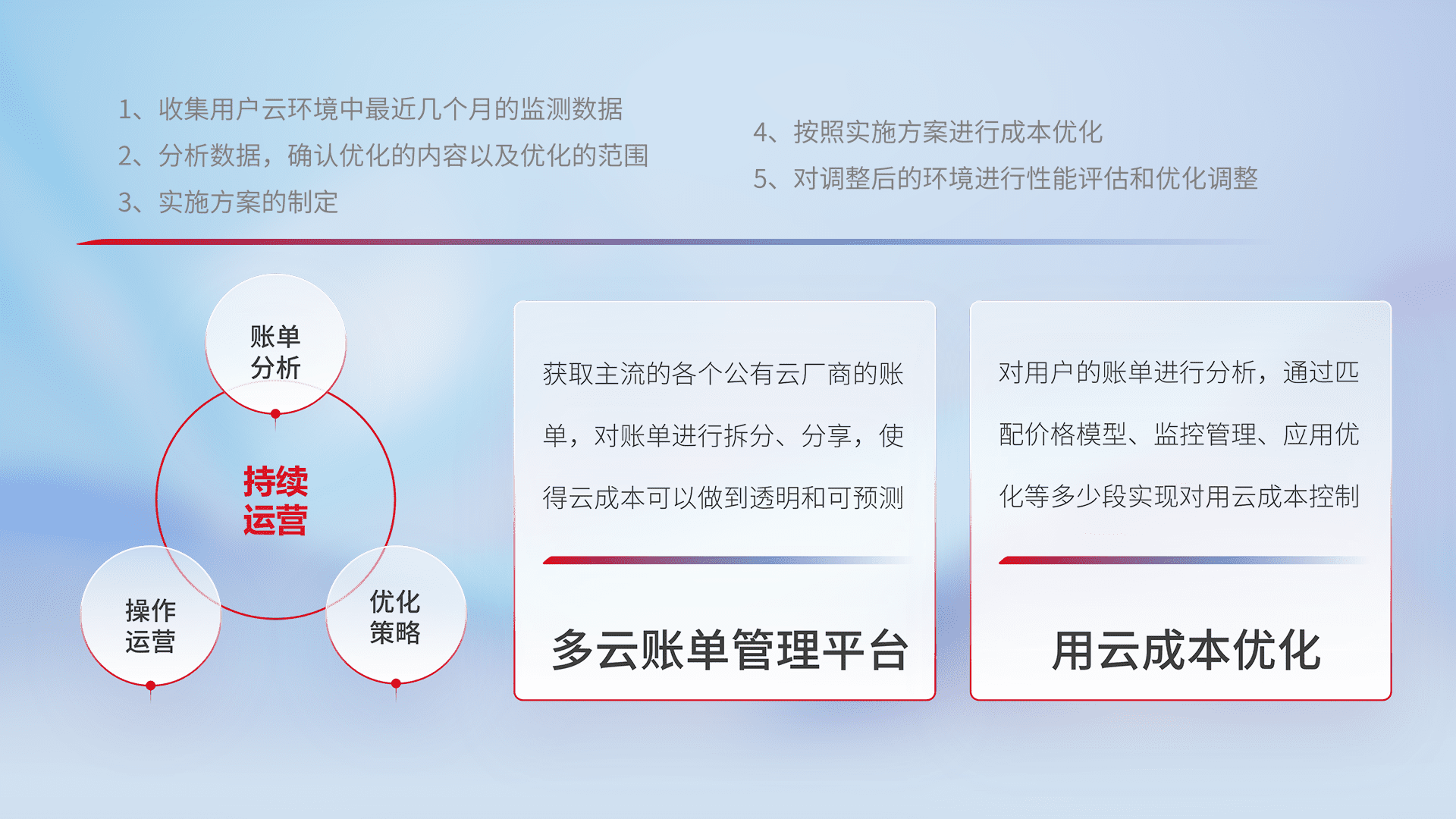 通过多云纳管,,,,以统一的资源数据模型把客户的云资源进行抽象和封装,,,进而实现对多云资源的统一操作,,,,保障云资源管理的可靠性、、、稳定性与可用性。。。量身定制化运维内容,,,,配置、、、开发运维、、、、补丁管理、、、备份、、、、监控、、、、认证和访问管理、、、、审计和日常巡检等,,,,保障在用云过程中的可靠度,,,稳定度以及高可用率。。。